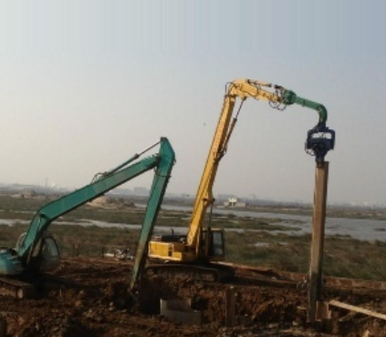液压振动打桩机主要安装在挖掘机上使用。高频液压振动打桩机内置两只偏心轴,采液压马达驱动,产生高速旋转及垂直激振力,透过减振橡胶块后,维持一定的振幅,能够应付多种类型的土质与打桩要求。激振力是与偏心轴尺寸和振动次数平方成正比,制作的偏心轴均经过详细计算与测试,兼顾的激振力和材料特性的匹配,不但能满足工作需要,同时保证了机械可靠度
