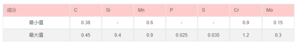 合金结构钢化学成分:碳C0.380.45%,硅Si0.170.37%,锰Mn0.500.80%,硫S:允许残余含量≤0.035%,磷P:允许残余含量≤0.035%,铬Cr0.901.20%,镍Ni:允许残余含量≤0.030%,铜Cu:允许残余含量≤0.030%,钼Mo0.150.25%